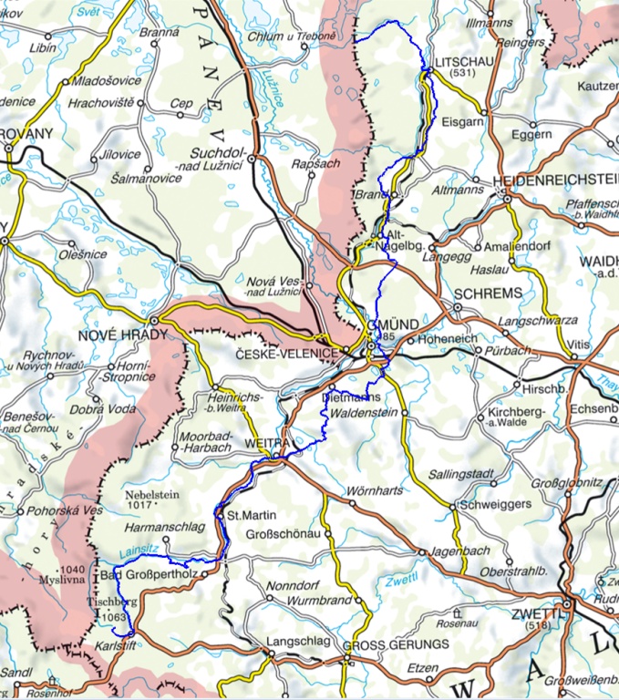 diese sehr nah an die Lainsitz heran oder überquert diese und endet in Gmünd.